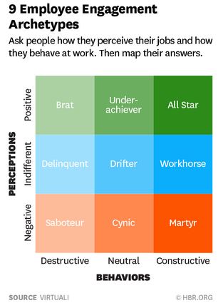 To sustainably improve business outcomes requires far more than changing behaviors. It also requires a focus on the perceptions of each individual – which drives the behavior change. The challenge is that there are many different facets of an employee’s disposition and behaviors – each of which requires a different approach to engage effectively. According to a 2015 Harvard Business Review study, 9 employee engagement archetypes developed by Sean Graber of Virtuali, Perceptions (from Negative to Indifferent to Positive) and Behaviors (from Destructive to Neutral to Constructive) generate a total of nine different combinations of employees as a result.